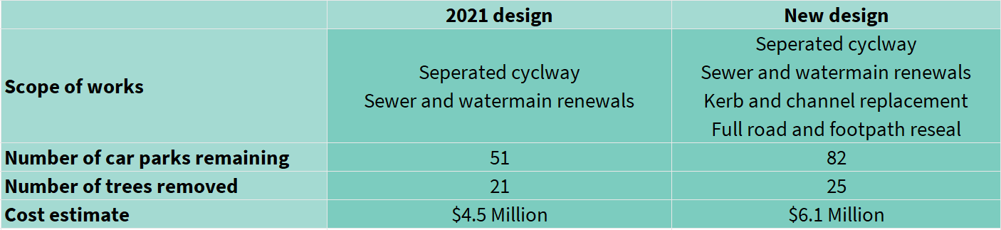 In 2021 we were planning to only build the cycleway and do the sewer and watermain renewals. Now, we are planning to do a full street renewal as well. The table below compares the scope of works between the 2021 design and current design.