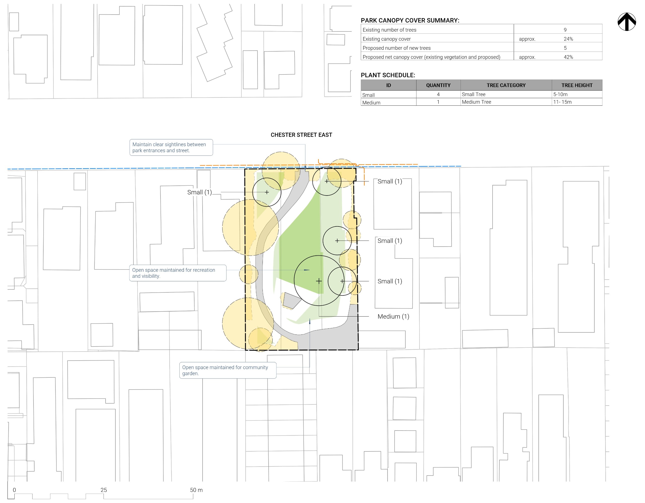 Swipe the slider from left to right to see the existing trees and where we plan to plant: